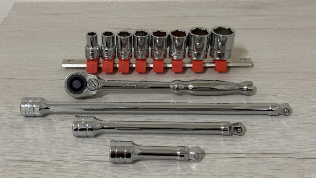 ソケット(写真一番上のいっぱい刺さってるやつ)は差込角9.5mm用のソケットセット